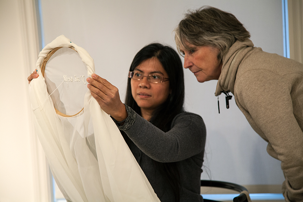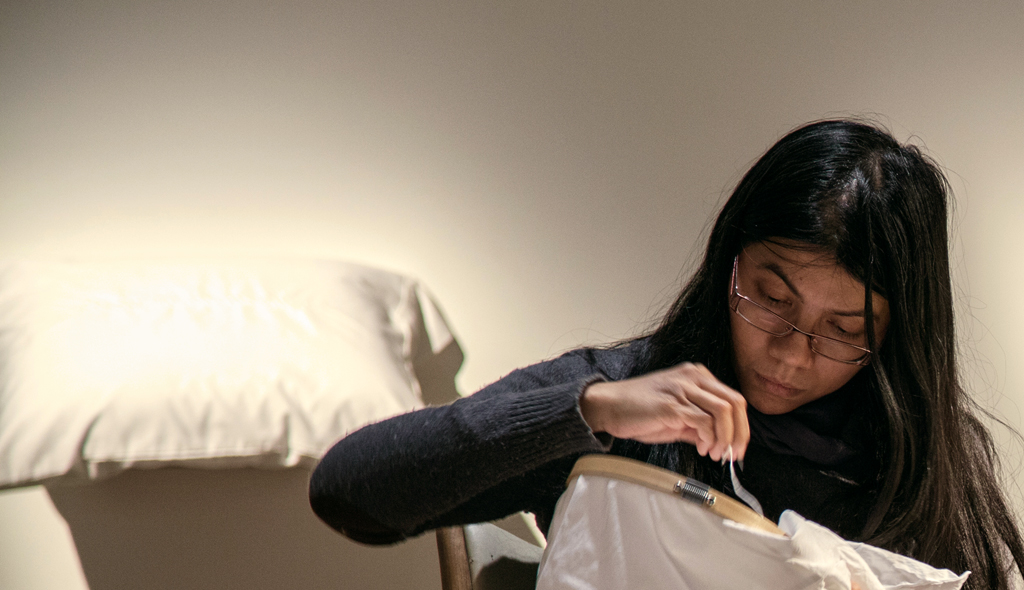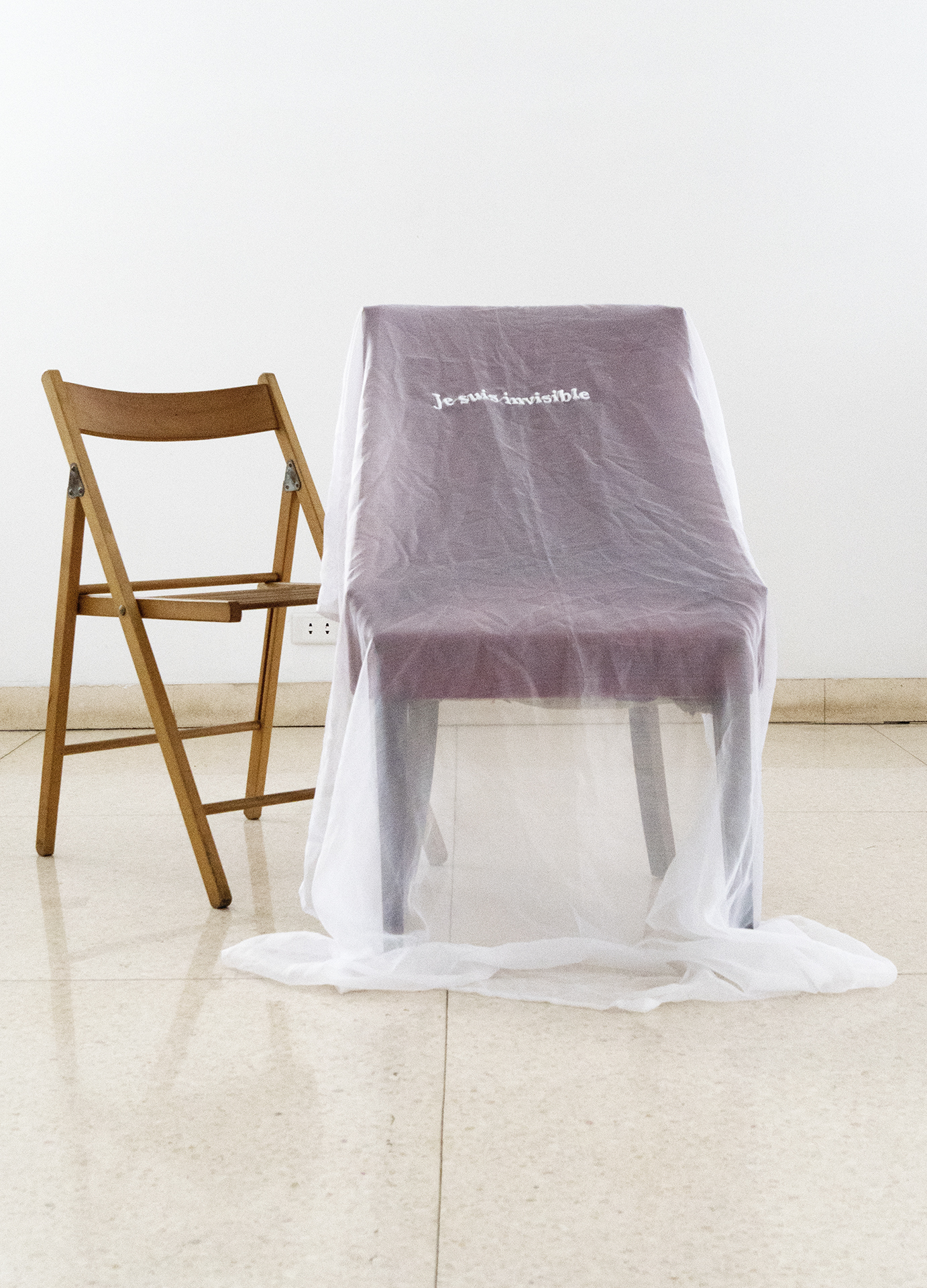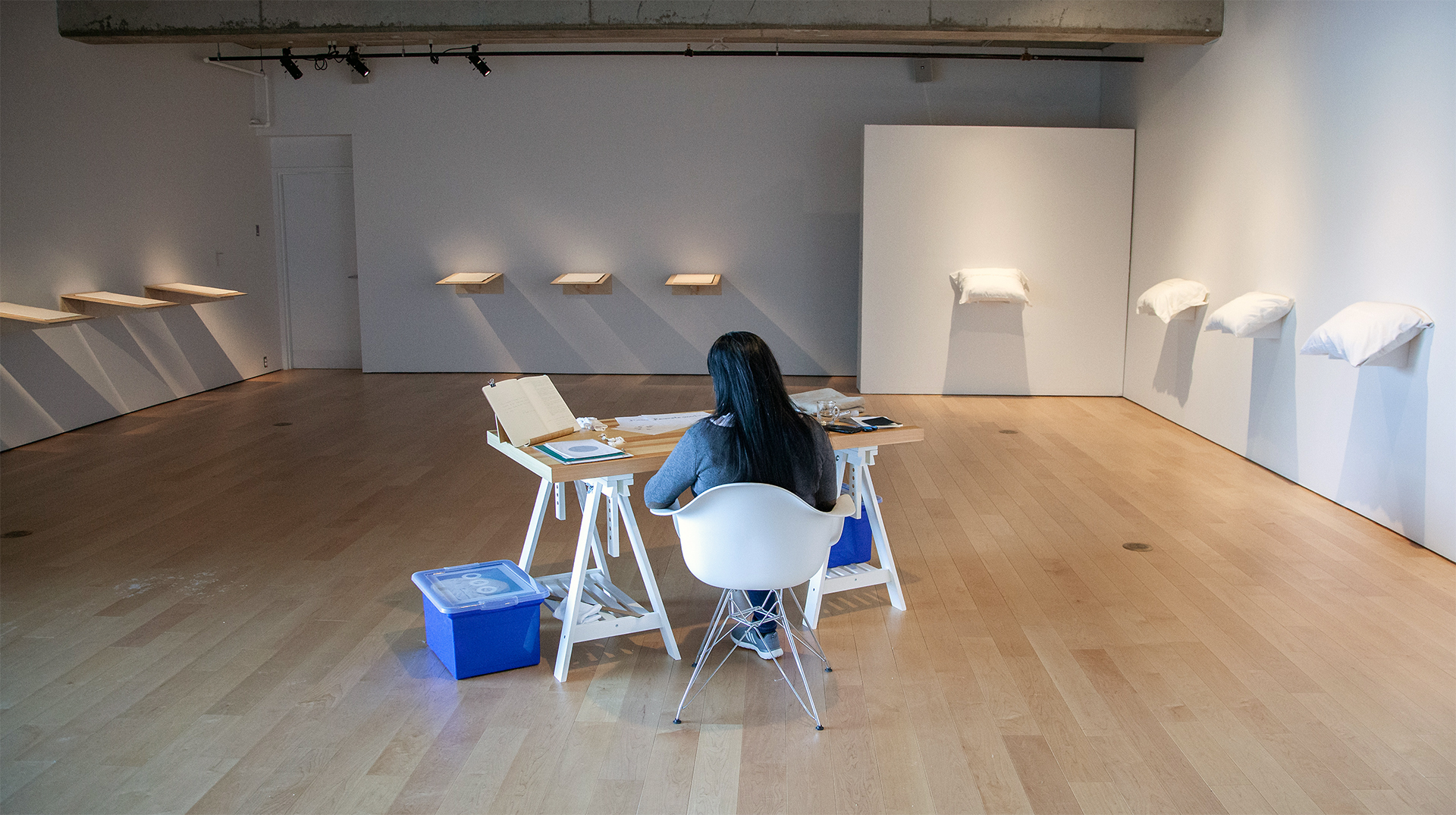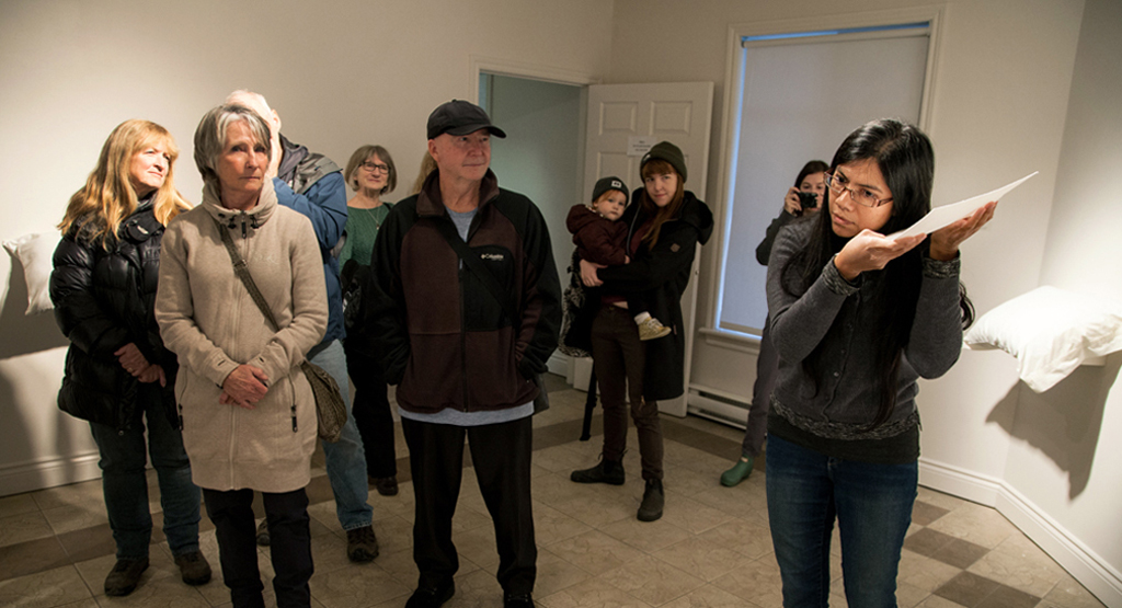 L’installation Insularités : au fil des voix, au fil de l’eau, présentée dans l’espace Colis suspect du 11 juin au 31 octobre 2022, évoquait des fragments d’images trouvées par l’artiste en parcourant l’archipel : les eaux profondes et les bleus infinis de la mer, des lacs et des étangs; le mouvement des bateaux et des cerfs-volants; la légèreté de l’écume des vagues et des nuages; etc. Des fils dessinaient des lignes qui participaient de cet univers aquatique mais qui faisaient aussi écho, par leur fragilité, aux liens émotionnels évoqués par les phrases et les mots qu’ils raccordaient. Cette écriture fragmentaire témoignait de certaines des notions et des questionnements soulevés lors des rencontres menées par l’artiste avec les participant.e.s au projet.