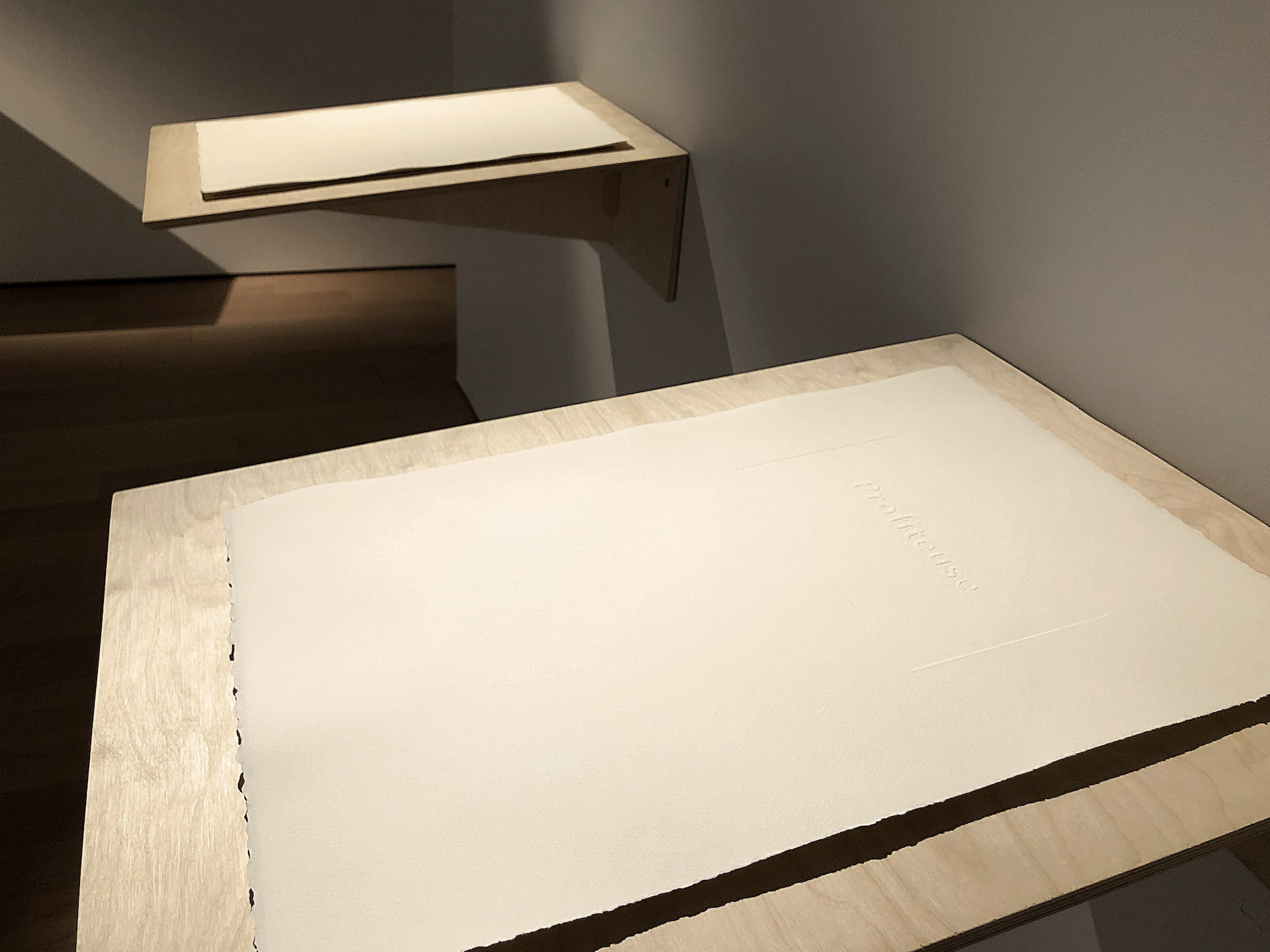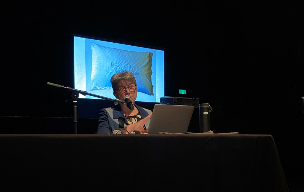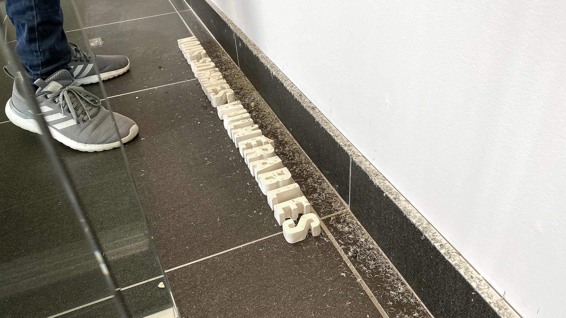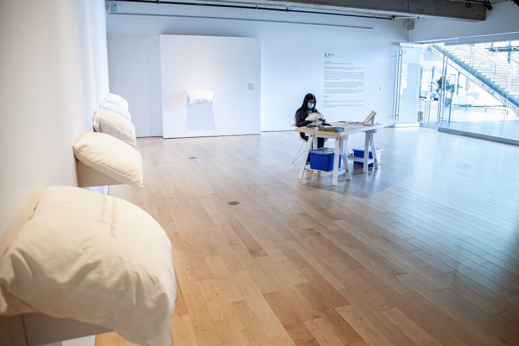 L’installation Insularités : au fil des voix, au fil de l’eau, présentée dans l’espace Colis suspect du 11 juin au 31 octobre 2022, évoquait des fragments d’images trouvées par l’artiste en parcourant l’archipel : les eaux profondes et les bleus infinis de la mer, des lacs et des étangs; le mouvement des bateaux et des cerfs-volants; la légèreté de l’écume des vagues et des nuages; etc. Des fils dessinaient des lignes qui participaient de cet univers aquatique mais qui faisaient aussi écho, par leur fragilité, aux liens émotionnels évoqués par les phrases et les mots qu’ils raccordaient. Cette écriture fragmentaire témoignait de certaines des notions et des questionnements soulevés lors des rencontres menées par l’artiste avec les participant.e.s au projet.