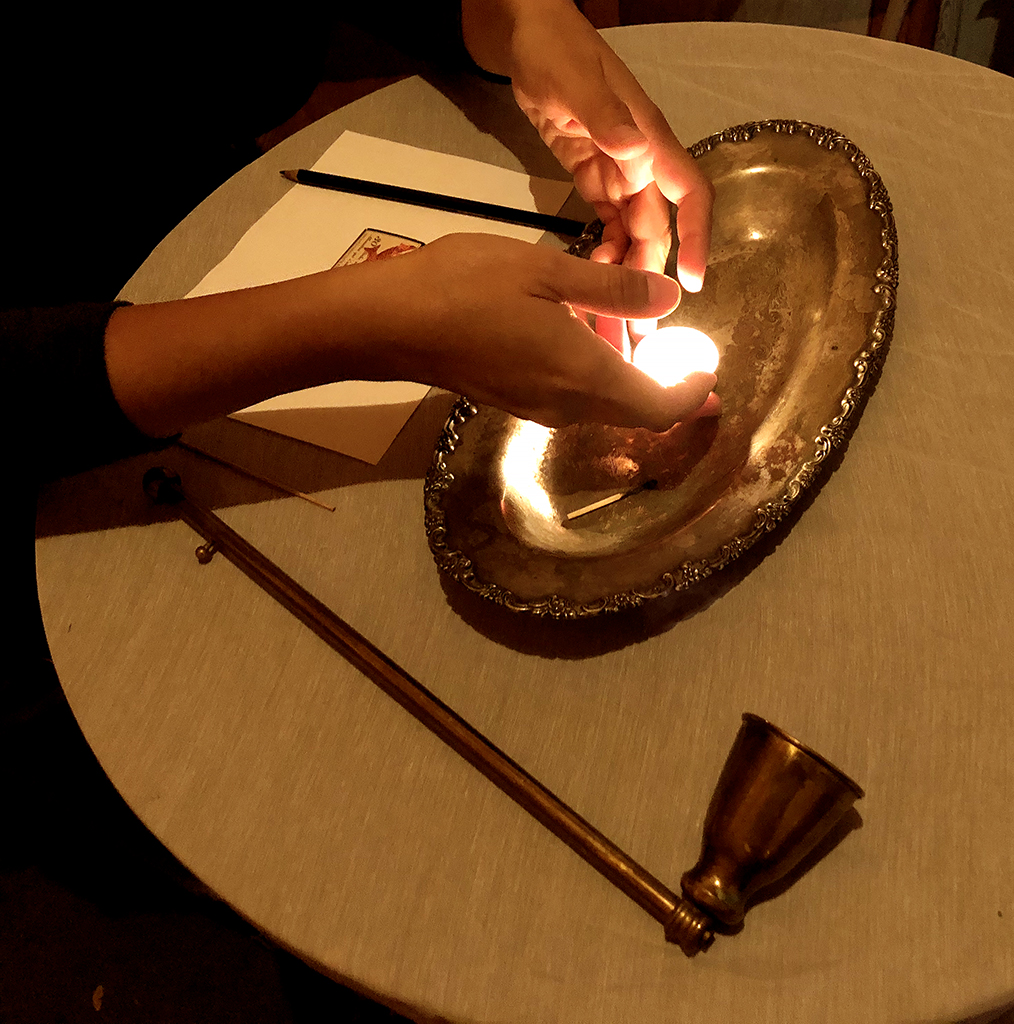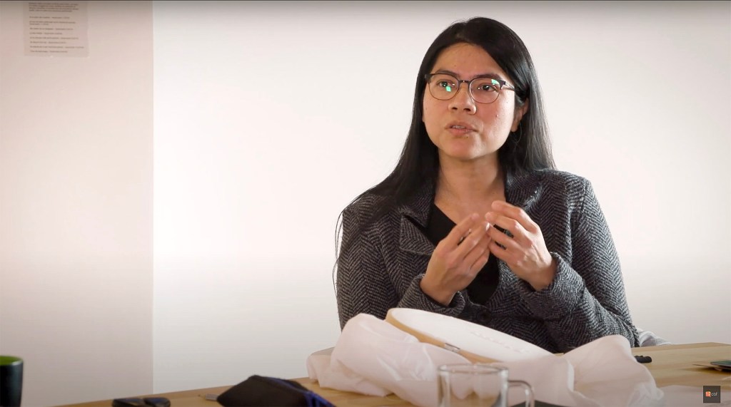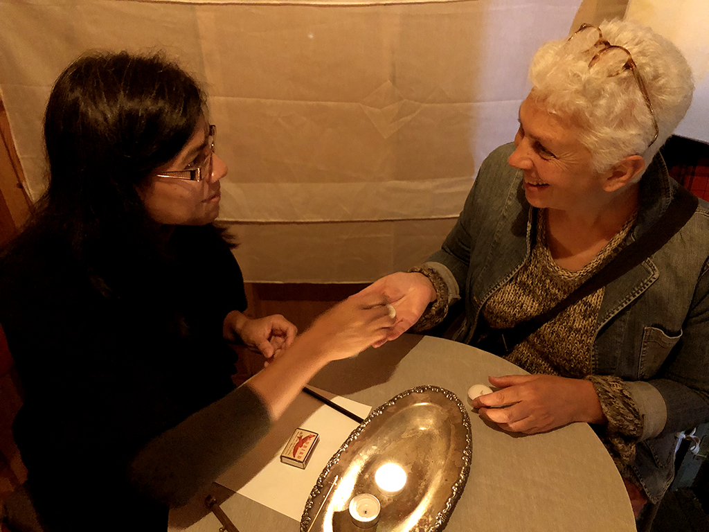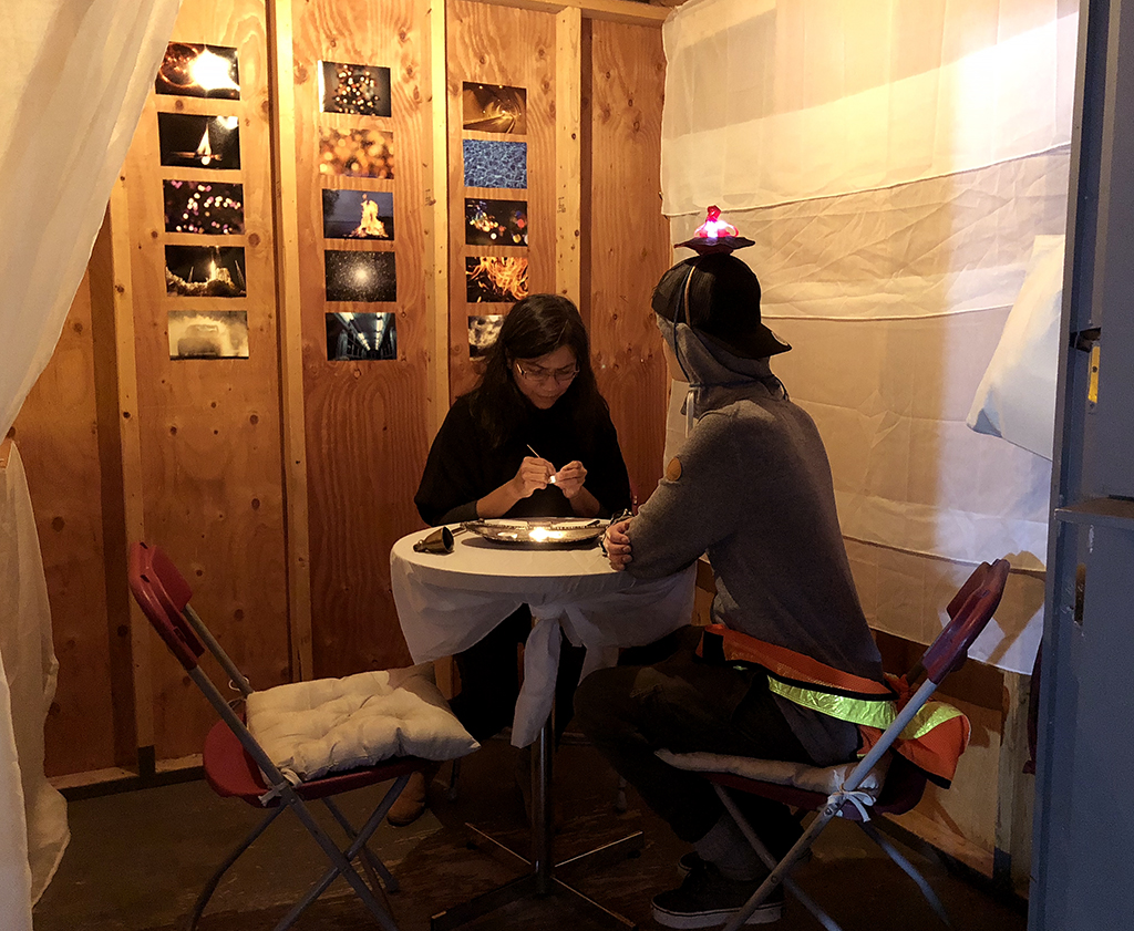 Généreusement accueillie pour l’occasion par l’entreprise locale Le Verger Poméloi dans ses installations, l’artiste a réalisé des rencontres avec deux groupes de travailleurs et travailleuses saisonier.ère.s venu.e.s aux Îles pour travailler dans la transformation du homard. Elle partageait avec les participant.e.s les origines mexicaines et l’espagnol comme langue maternelle. Autour d’une grande table, le dialogue s’est tissé inspiré par des mots écrits sur des petits « îlots » de papier qu’y étaient déployés. Il était question, entre autres, d’échanger au sujet d’expériences individuelles de migration et de rapports au territoire madelinot, à la lumière des histoires de vie singulières des participant.e.s. Il s’agissait aussi de réfléchir autour de ce qui lie et ce qui sépare les gens dans ce genre d’expériences.