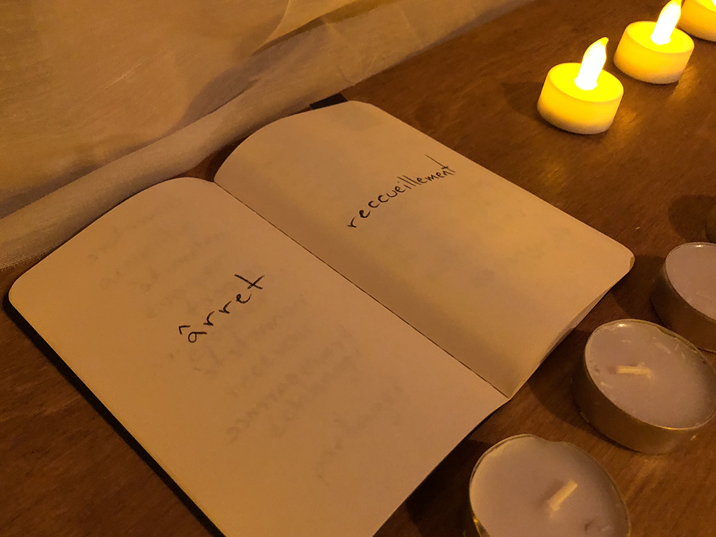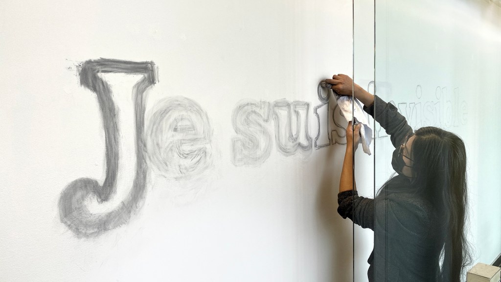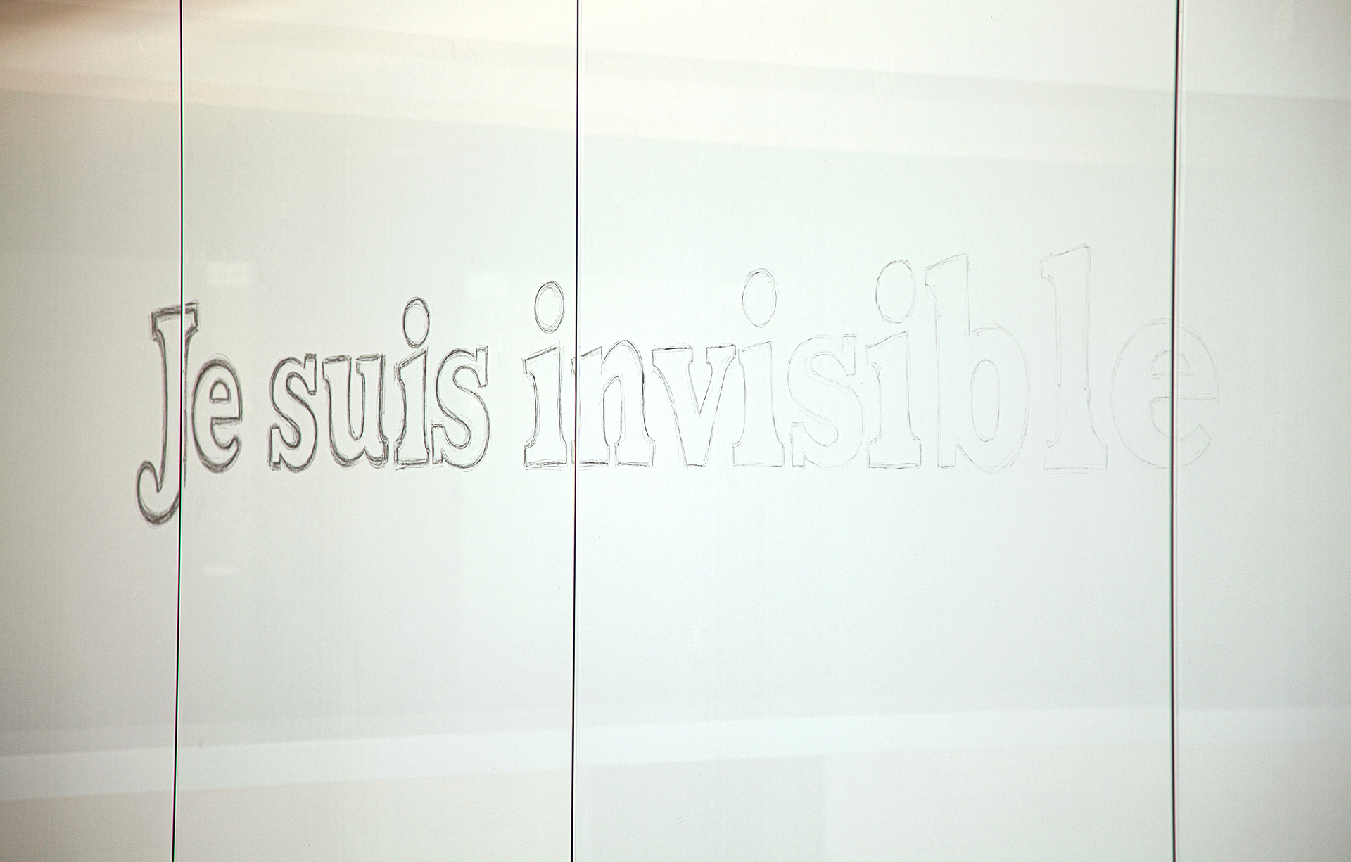 Au cours de sa résidence aux Îles-de-la-Madeleine, l’artiste a réalisé une série d’interventions sur le mur d’un entrepôt situé à Bassin. La famille Gallant, originaire des Îles et propriétaire de l’immeuble, a été approchée par l’intermédiaire du centre d’artistes et a généreusement accepté que l’une des surfaces de leur bâtiment soit utilisée comme un grand tableau noir par l’artiste. Sous l’idée d’un Journal de bord à ciel ouvert, elle a partagé périodiquement, avec les voisin.e.s du lieu et avec les passant.e.s, des mots et des réflexions inspirant sa recherche. Elle a ainsi inscrit dans l’espace public ce qui d’habitude reste consigné dans l’intimité des notes du calepin de l’artiste.