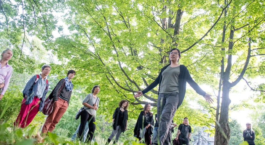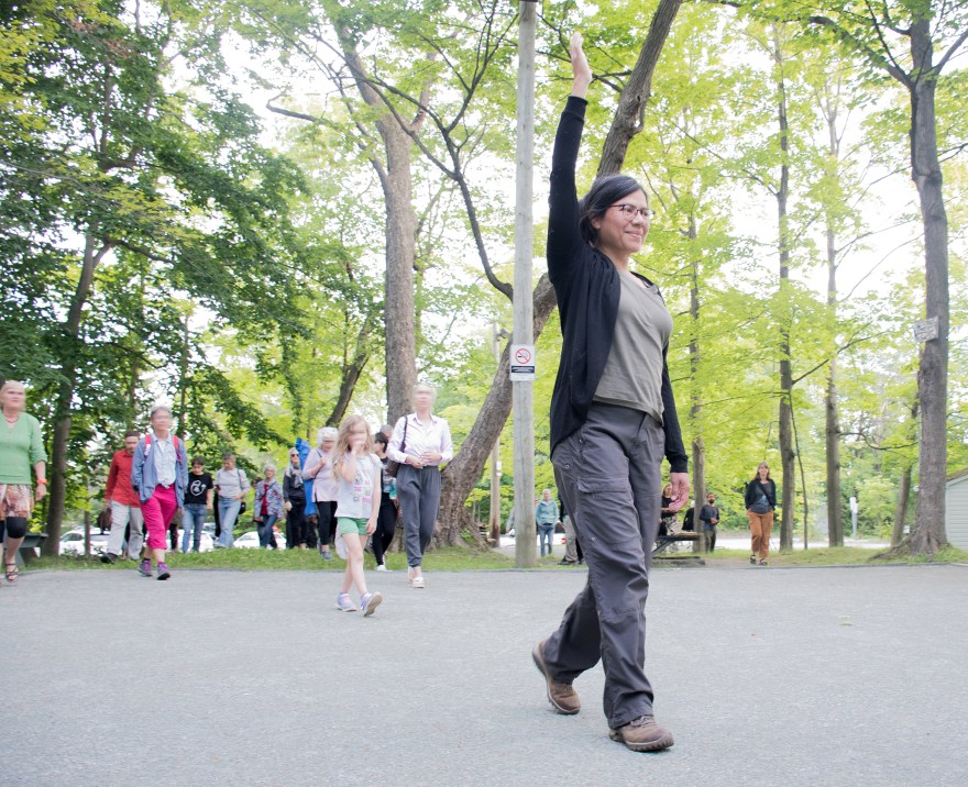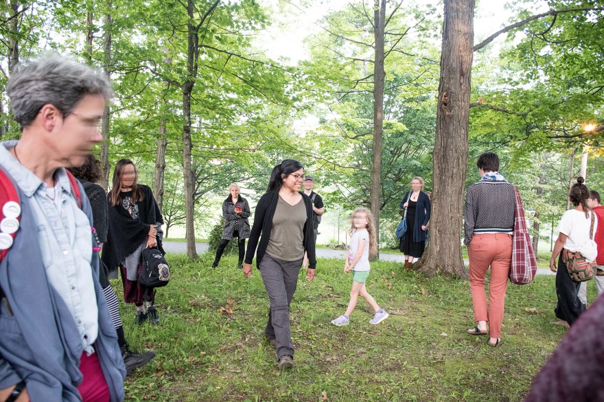 L’artiste a demandé à des personnes rencontrées de façon spontanée en marchant à Bassin – localité située sur l’Île-du-Havre-Aubert, où elle logeait dans l’archipel – et à d’autres personnes qui l’ont été présentées « de fil en aiguille », si elles voulaient faire une marche avec elle, l’amener à un lieu avec lequel elles avaient un rapport particulier, significatif. Pendant les marches, l’artiste invitait les participant.e.s à parler du lieu, à raconter l’histoire qui les liait à celui-ci et elle partageait à son tour les résonnances de ces récits sur sa propre histoire. Une intimité partagée s’est tissée. Lors de ces rencontres, l’artiste demandait aussi aux participant.e.s de faire une courte action avec elle, en utilisant des matériaux qu’elle avait apportés (des fils, des cordes, des bribes de papier, etc.). Un geste était posé à deux; un geste qui pourrait s’avérer significatif, rendre visible le lien qui avait été tissé par le dialogue et témoigner du temps partagé. Ainsi, dans la fluidité de ces échanges, une série d’actions performatives a pris forme et a donné lieu à la création de divers objets témoignes.