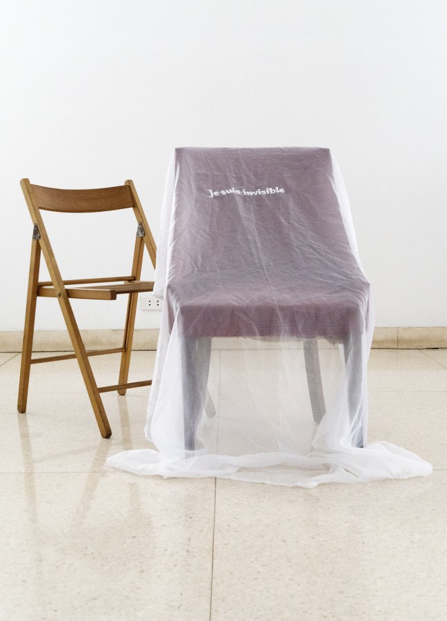 Bajo el interés de generar un diálogo entre su trabajo textil y el espacio que la recibiría durante tres semanas, la artista abordó este proyecto de exposición individual – al inicio de su residencia – a partir de una serie de instalaciones. En cuatro de ellas (Intrusa, Soy invisible, Tengo tanto miedo e Impostora), sus piezas bordadas dialogaban con el espacio arquitectónico y con el mobiliario de Artista X Artista, lo que generó nuevas lecturas de obras textiles realizadas con anterioridad. Dos otras obras formaban parte de la exposición: una escultura textil (Perderlo todo / Todos mis errores se volverán visibles) y una instalación (Fallar por completo / Esperando lo que nunca va a llegar) que ponían en relación el mobiliario del lugar con una escritura que la artista realizó sobre el muro de la sala.