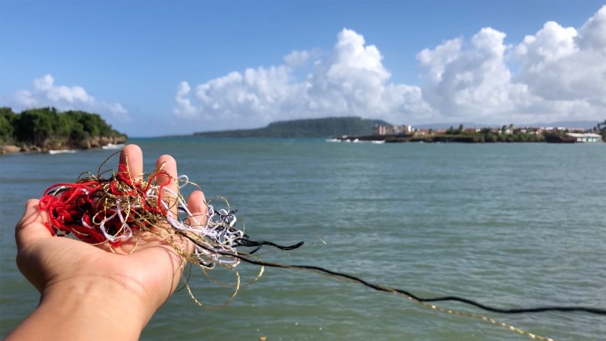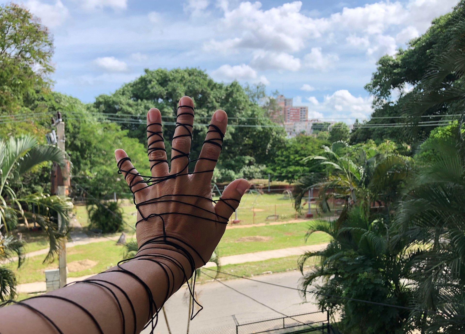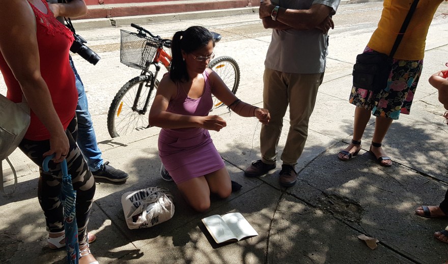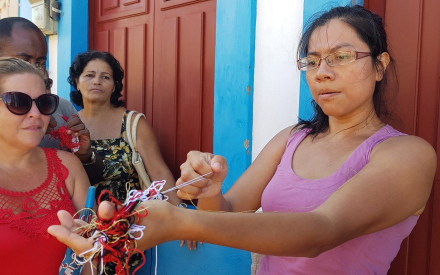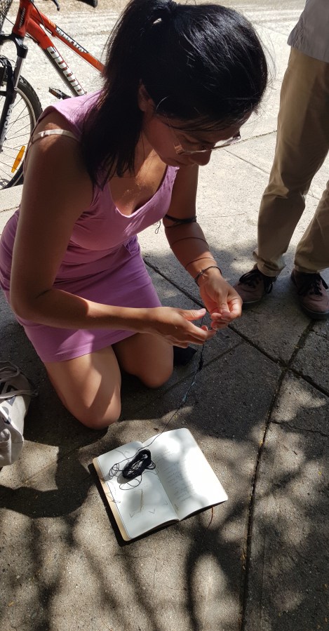 En El hilo y la cadena / Deambulaciones, un pequeño grupo de habitantes de Baracoa interesados en la historia de su ciudad fueron reunidos con el fin de seguir un recorrido orquestado por el historiador Enrique Floirian, a petición de la artista. Durante paradas puntuales en lugares que tenían una carga importante del pasado colonial, como el Fuerte Matachín, el Parque La Victoria o la Catedral de Baracoa, Enrique Floirian contaba a los participantes la historia de la fundación de la ciudad y las particularidades del pasado esclavista de este territorio cubano. En estos mismos lugares, la artista realizó una serie de acciones performativas en diálogo con este discurso histórico. Enunciaba fragmentos de historias poéticas que hablaban de la memoria personal o colectiva, en relación con la esclavitud o con la noción de territorio y realizaba gestos gracias a los que una serie de objetos materiales se transformaban en múltiples objetos simbólicos ligados a dichas historias. Así, por ejemplo, un cuaderno se transformaba en barraca y enseguida en las olas del mar; un conjunto de hilos, se volvían un corazón, sangre, cadenas o un mapa. Algunos participantes que portaban una maraña de hilos rojos recibida de la artista trataban de deshacerla a lo largo del recorrido. En medio de cada uno de esos enredos de hilos, se encontraba un diminuto papel en el que estaba escrito un fragmento poético de una narración acerca de la esclavitud; los participantes habían sido invitados a leerlos al resto del grupo, en el momento en el que ellos encontraran alguna resonancia con los discursos del historiador o de la artista, con las acciones performativas o con los lugares recorridos. Durante el trayecto, la poeta Gertrudis Labaceno, de Baracoa, compartió con el grupo espontánea y puntualmente algunos de sus poemas vinculados a la historia de los afrodescendientes o a la noción de territorio.